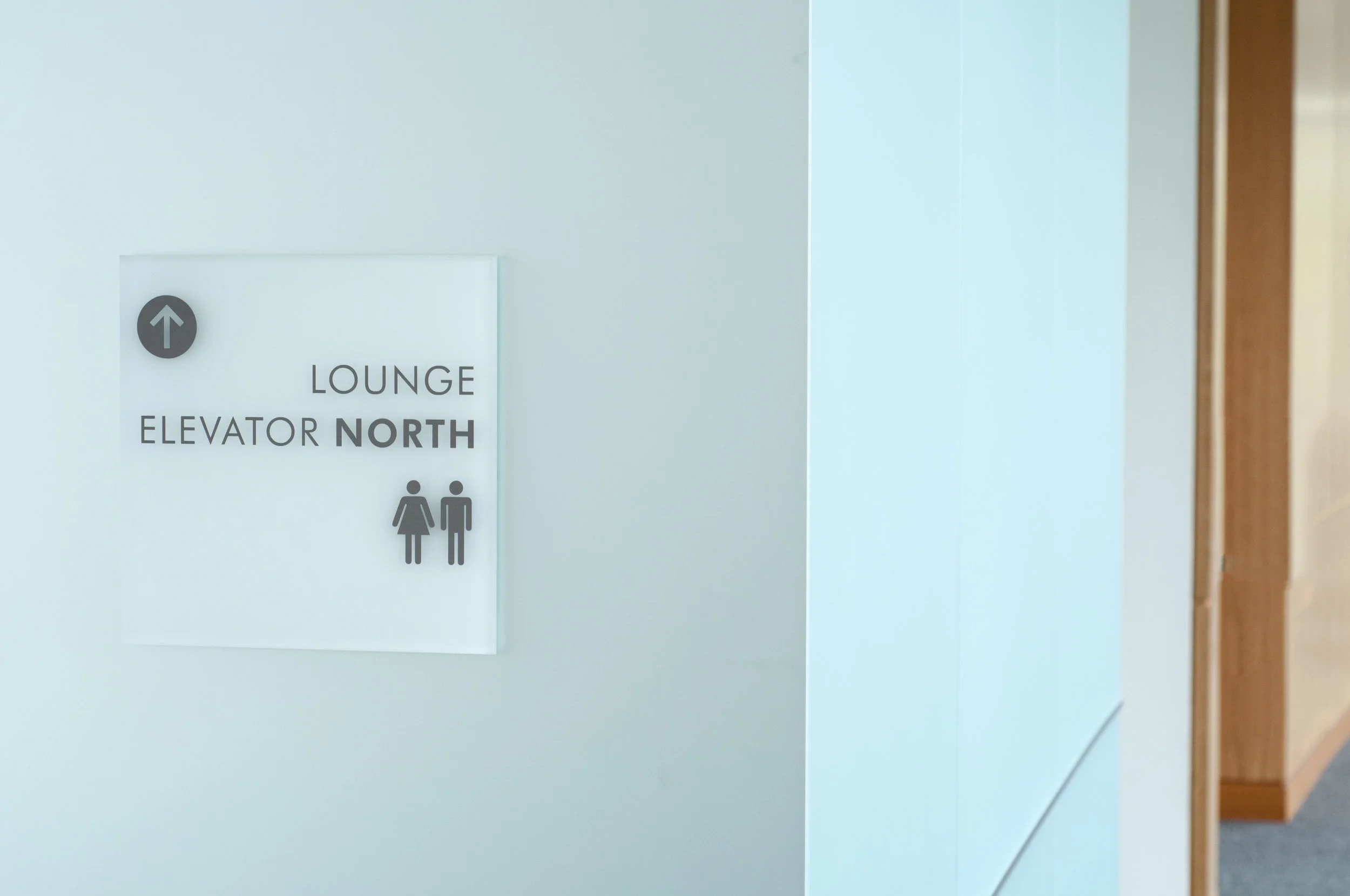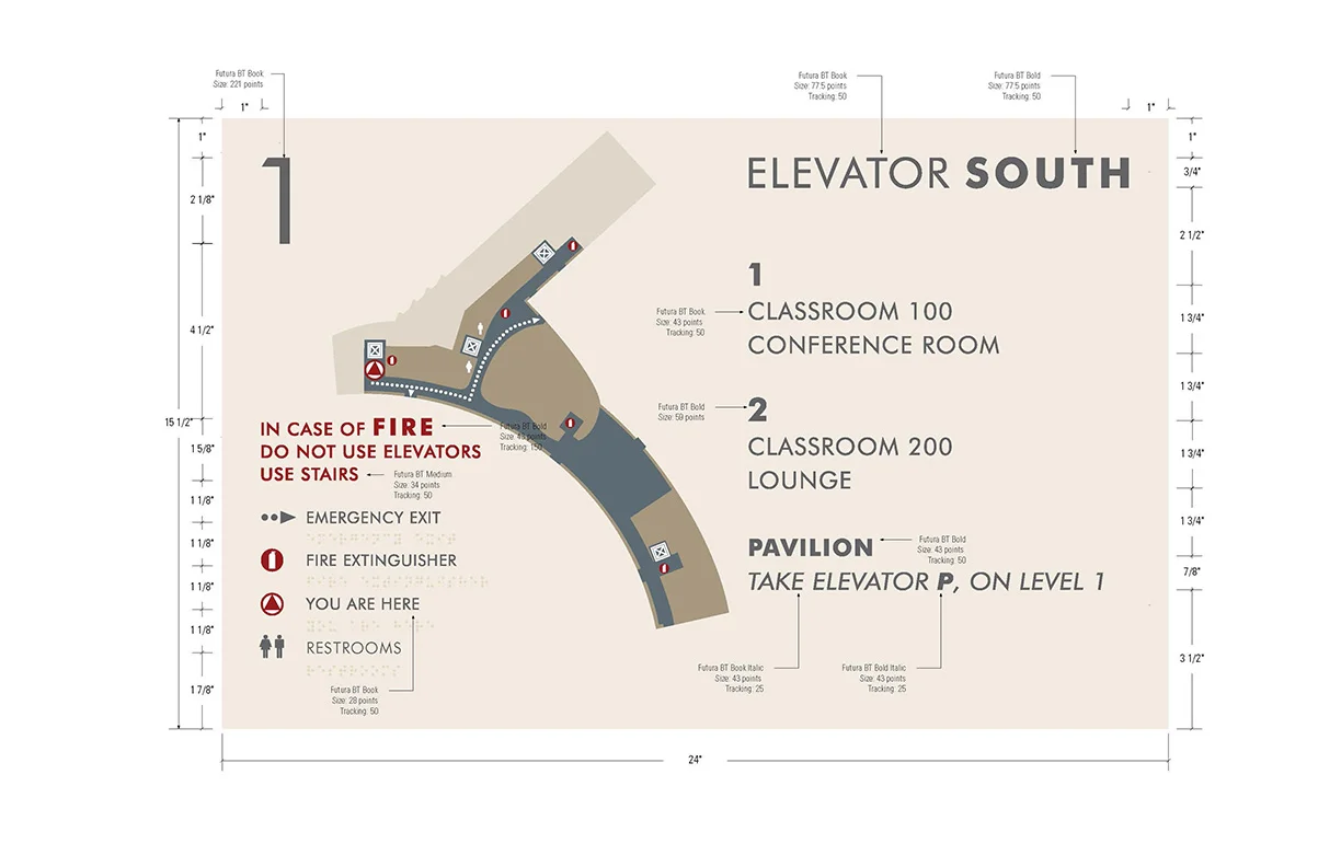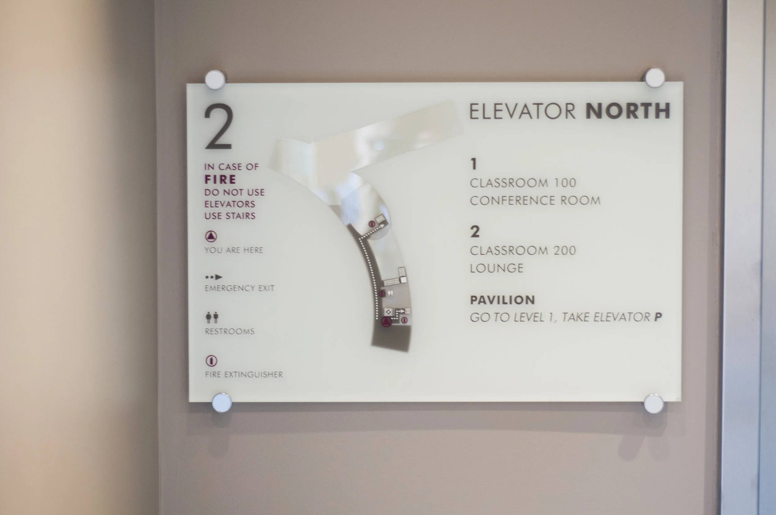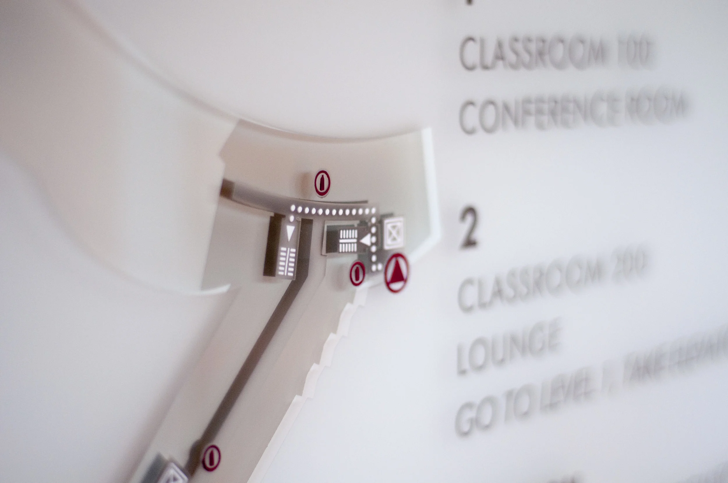 The creation of a comprehensive signage master plan for Harvard's Tata Hall, including tactile maps and directional signage. 3-dimensional block lettering was used to highlight classrooms, living groups, and elevators. Donor Recognition was designed for the main entry area, with individual aluminum letters inlaid into perforated wood panels.
